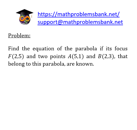 Problem: Find the equation of the parabola if its focus \( F(2,5) \) and two points \( A(5,1) \) and \( B(2,3) \), that belong to this parabola, are known.