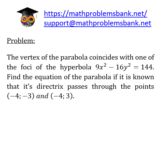 Problem: The vertex of the parabola coincides with one of the foci of the hyperbola \( 9 x^{2}-16 y^{2}=144 \). Find the equation of the parabola if it is known that it's directrix passes through the points \( (-4 ;-3) \) and \( (-4 ; 3) \).