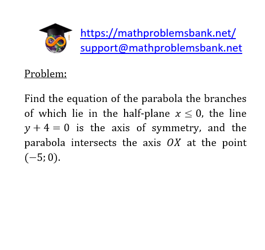 Problem: Find the equation of the parabola the branches of which lie in the half-plane \( x \leq 0 \), the line \( y+4=0 \) is the axis of symmetry, and the parabola intersects the axis \( O X \) at the point \( (-5 ; 0) \).