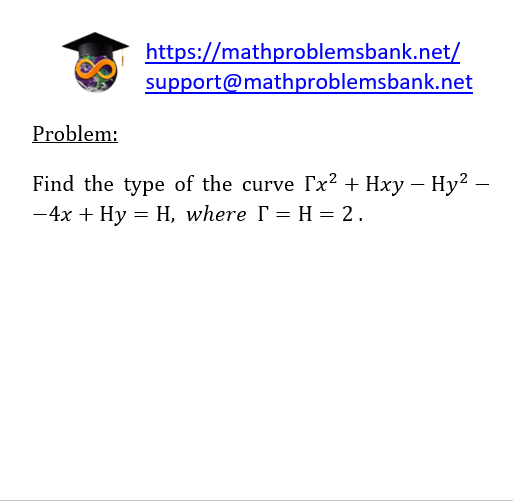 Problem: Find the type of the curve \( \Gamma x^{2}+\mathrm{H} x y-\mathrm{H} y^{2}- \) \( -4 x+\mathrm{H} y=\mathrm{H} \), where \( \Gamma=\mathrm{H}=2 \).