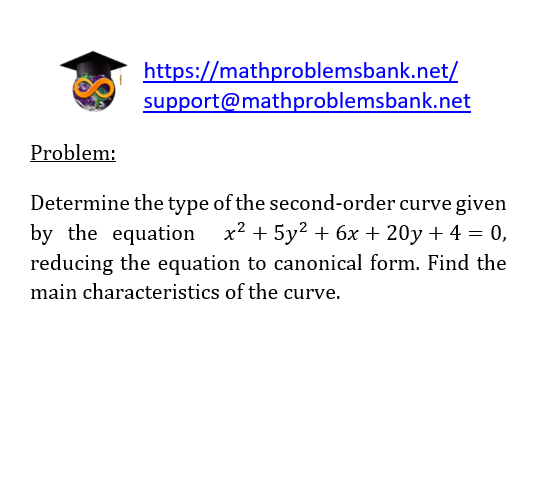 Problem: Determine the type of the second-order curve given by the equation \( x^{2}+5 y^{2}+6 x+20 y+4=0 \), reducing the equation to canonical form. Find the main characteristics of the curve.