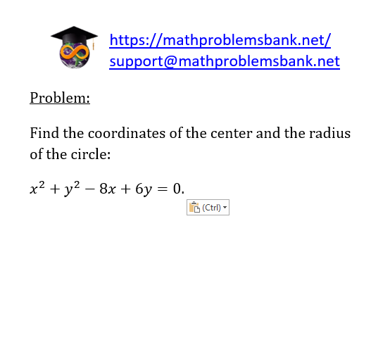 Problem: Find the coordinates of the center and the radius of the circle: \[ x^{2}+y^{2}-8 x+6 y=0 \text {. } \] 밤 \( (\mathrm{Ctrl}) \cdot \)