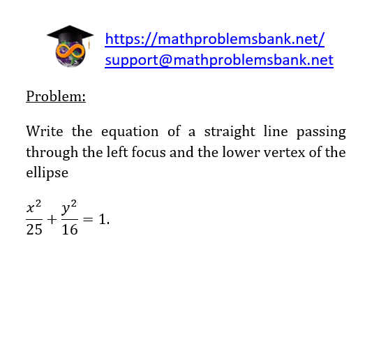 Problem: Write the equation of a straight line passing through the left focus and the lower vertex of the ellipse \[ \frac{x^{2}}{25}+\frac{y^{2}}{16}=1 . \]