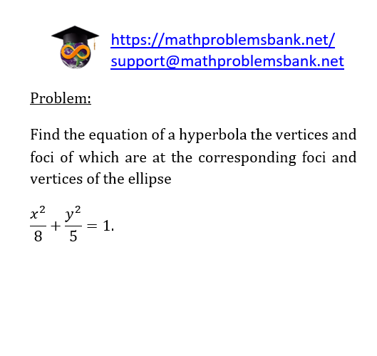 Problem: Find the equation of a hyperbola the vertices and foci of which are at the corresponding foci and vertices of the ellipse \[ \frac{x^{2}}{8}+\frac{y^{2}}{5}=1 \text {. } \]