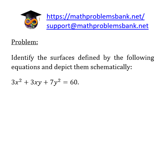 Problem: Identify the surfaces defined by the following equations and depict them schematically: \[ 3 x^{2}+3 x y+7 y^{2}=60 \text {. } \]