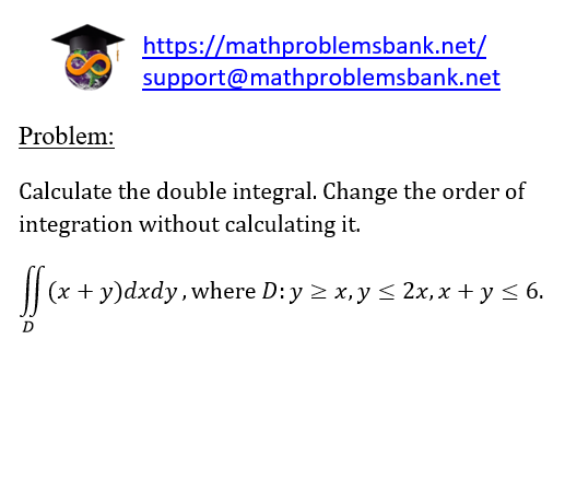 Problem: Calculate the double integral. Change the order of integration without calculating it. \[ \iint_{D}(x+y) d x d y \text {, where } D: y \geq x, y \leq 2 x, x+y \leq 6 \text {. } \]