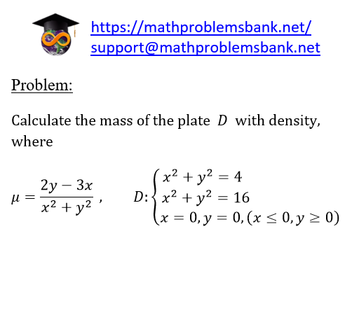 Problem: Calculate the mass of the plate \( D \) with density, where \[ \mu=\frac{2 y-3 x}{x^{2}+y^{2}}, \quad D:\left\{\begin{array}{l} x^{2}+y^{2}=4 \\ x^{2}+y^{2}=16 \\ x=0, y=0,(x \leq 0, y \geq 0) \end{array}\right. \]