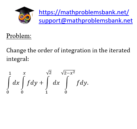 Problem: Change the order of integration in the iterated integral: \[ \int_{0}^{1} d x \int_{0}^{x} f d y+\int_{1}^{\sqrt{2}} d x \int_{0}^{\sqrt{2-x^{2}}} f d y . \]