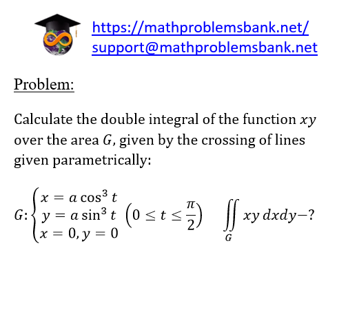 Problem: Calculate the double integral of the function \( x y \) over the area \( G \), given by the crossing of lines given parametrically: \[ G:\left\{\begin{array}{l} x=a \cos ^{3} t \\ y=a \sin ^{3} t \\ x=0, y=0 \end{array}\left(0 \leq t \leq \frac{\pi}{2}\right) \quad \iint_{G} x y d x d y-?\right. \]