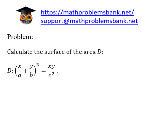 Problem: Calculate the surface of the area \( D \) : \[ D:\left(\frac{x}{a}+\frac{y}{b}\right)^{3}=\frac{x y}{c^{2}} \text {. } \]