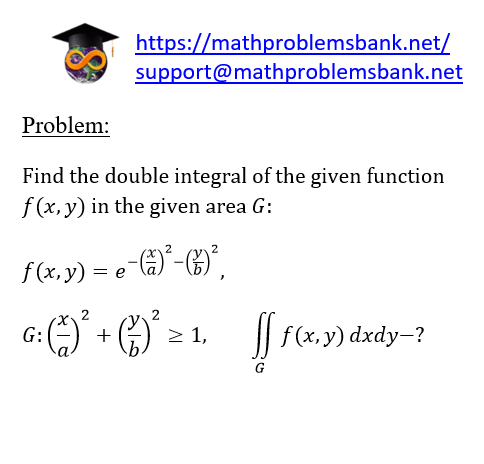 Problem: Find the double integral of the given function \( f(x, y) \) in the given area \( G \) : \[ \begin{array}{l} f(x, y)=e^{-\left(\frac{x}{a}\right)^{2}-\left(\frac{y}{b}\right)^{2}} \\ G:\left(\frac{x}{a}\right)^{2}+\left(\frac{y}{b}\right)^{2} \geq 1, \quad \iint_{G} f(x, y) d x d y-? \end{array} \]