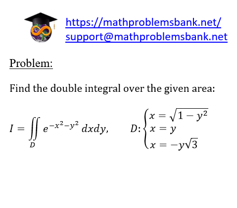 Problem: Find the double integral over the given area: \[ I=\iint_{D} e^{-x^{2}-y^{2}} d x d y, \quad D:\left\{\begin{array}{l} x=\sqrt{1-y^{2}} \\ x=y \\ x=-y \sqrt{3} \end{array}\right. \]