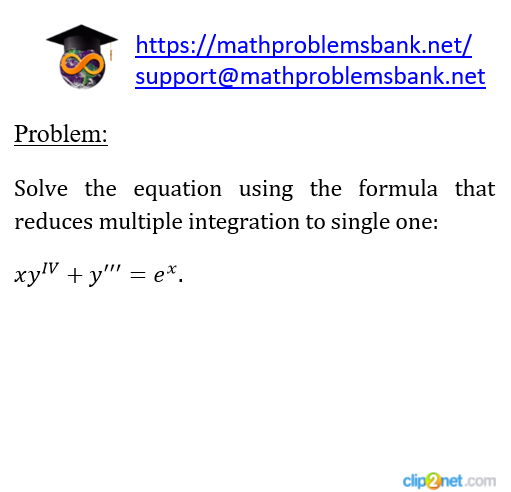 Problem: Solve the equation using the formula that reduces multiple integration to single one: \[ x y^{I V}+y^{\prime \prime \prime}=e^{x} \text {. } \]