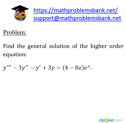 Problem: Find the general solution of the corresponding homogeneous differential equation and the form of the particular solution for the higher order differential equation: \[ y^{(4)}-2 y^{\prime \prime \prime}+y^{\prime}-2 y=\left(x^{2}+x\right) e^{2 x}+1 \text {. } \] clip2net.com