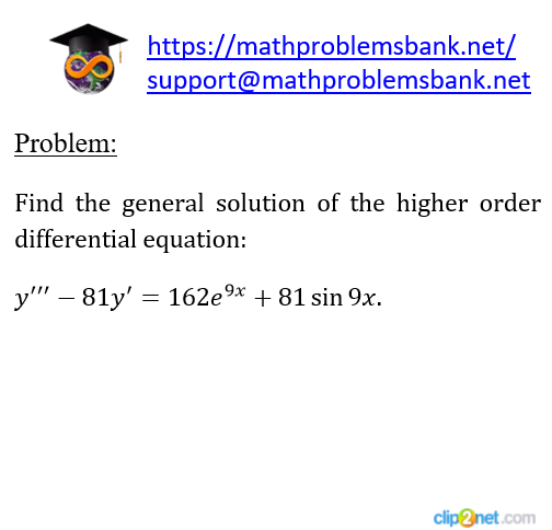 Problem: Find the general solution of the higher order differential equation: \[ y^{\prime \prime \prime}-81 y^{\prime}=162 e^{9 x}+81 \sin 9 x \text {. } \]