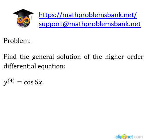 Problem: Find the general solution of the higher order differential equation: \[ y^{(4)}=\cos 5 x \text {. } \]