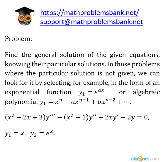 Problem: Find the general solution of the given equations, knowing their particular solutions. In those problems where the particular solution is not given, we can look for it by selecting, for example, in the form of an exponential function \( y_{1}=e^{a x} \) or algebraic polynomial \( y_{1}=x^{n}+a x^{n-1}+b x^{n-2}+\cdots \). \[ \begin{array}{l} \left(x^{2}-2 x+3\right) y^{\prime \prime \prime}-\left(x^{2}+1\right) y^{\prime \prime}+2 x y^{\prime}-2 y=0, \\ y_{1}=x, y_{2}=e^{x} . \end{array} \]