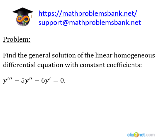 Problem: Find the general solution of the linear homogeneous differential equation with constant coefficients: \[ y^{\prime \prime \prime}+5 y^{\prime \prime}-6 y^{\prime}=0 . \] clip2net.com