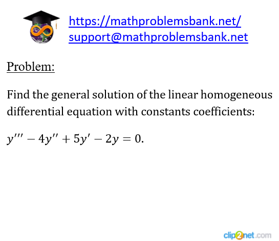 Problem: Find the general solution of the linear homogeneous differential equation with constants coefficients: \[ y^{\prime \prime \prime}-4 y^{\prime \prime}+5 y^{\prime}-2 y=0 \text {. } \] clip2net.com