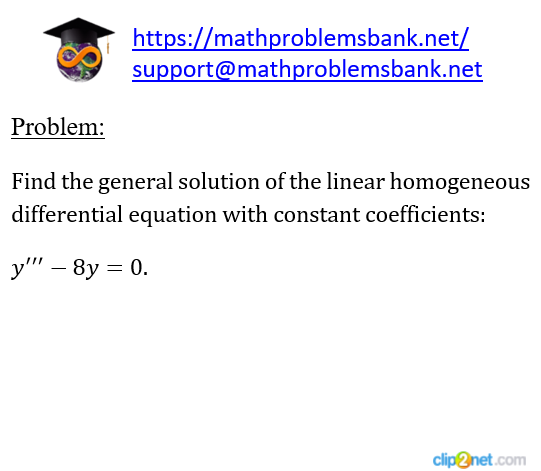 Problem: Find the general solution of the linear homogeneous differential equation with constant coefficients: \[ y^{\prime \prime \prime}-8 y=0 \text {. } \] clip2net.com