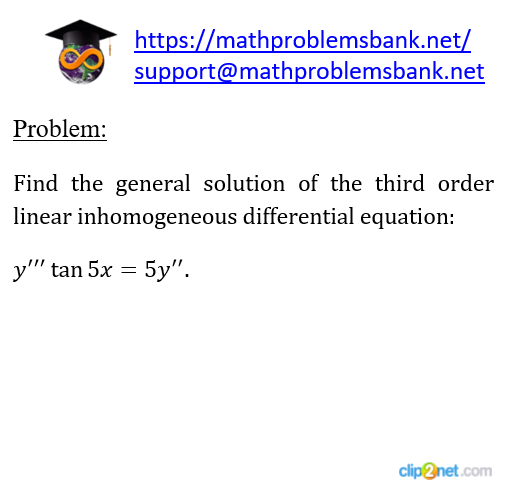 Problem: Find the general solution of the third order linear inhomogeneous differential equation: \[ y^{\prime \prime \prime} \tan 5 x=5 y^{\prime \prime} \text {. } \]