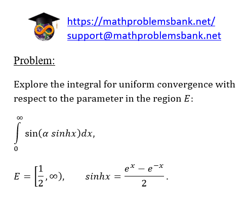 Problem: Explore the integral for uniform convergence with respect to the parameter in the region \( E \) : \[ \begin{array}{l} \int_{0}^{\infty} \sin (\alpha \sinh x) d x, \\ E=\left[\frac{1}{2}, \infty\right), \quad \sinh x=\frac{e^{x}-e^{-x}}{2} . \end{array} \]
