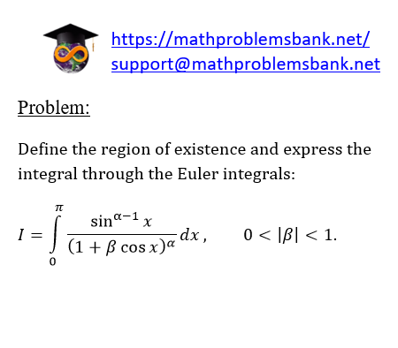 Problem: Define the region of existence and express the integral through the Euler integrals: \[ I=\int_{0}^{\pi} \frac{\sin ^{\alpha-1} x}{(1+\beta \cos x)^{\alpha}} d x, \quad 0<|\beta|<1 . \]