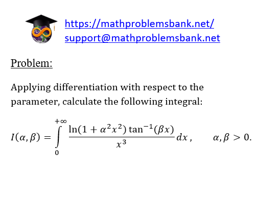 Problem: Applying differentiation with respect to the parameter, calculate the following integral: \[ I(\alpha, \beta)=\int_{0}^{+\infty} \frac{\ln \left(1+\alpha^{2} x^{2}\right) \tan ^{-1}(\beta x)}{x^{3}} d x, \quad \alpha, \beta>0 . \]