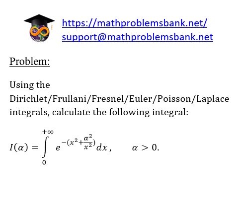 Problem: Using the Dirichlet/Frullani/Fresnel/Euler/Poisson/Laplace integrals, calculate the following integral: \[ I(\alpha)=\int_{0}^{+\infty} e^{-\left(x^{2}+\frac{\alpha^{2}}{x^{2}}\right)} d x, \quad \alpha>0 . \]