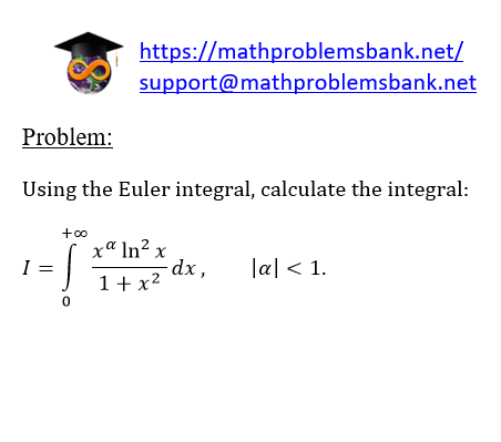Problem: Using the Euler integral, calculate the integral: \[ I=\int_{0}^{+\infty} \frac{x^{\alpha} \ln ^{2} x}{1+x^{2}} d x, \quad|\alpha|<1 . \]