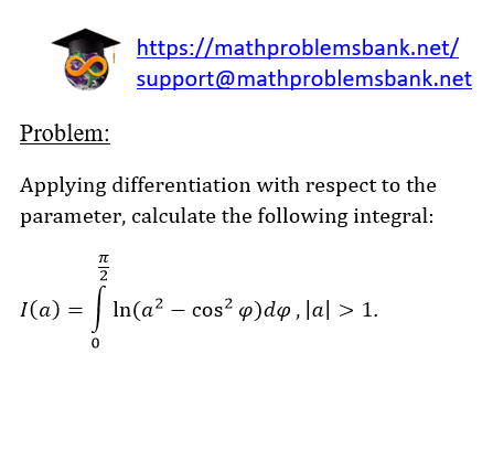 Problem: Applying differentiation with respect to the parameter, calculate the following integral: \[ I(a)=\int_{0}^{\frac{\pi}{2}} \ln \left(a^{2}-\cos ^{2} \varphi\right) d \varphi,|a|>1 . \]
