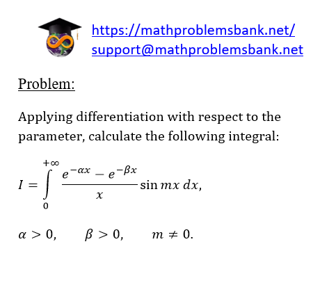 Problem: Applying differentiation with respect to the parameter, calculate the following integral: \[ \begin{array}{l} I=\int_{0}^{+\infty} \frac{e^{-\alpha x}-e^{-\beta x}}{x} \sin m x d x, \\ \alpha>0, \quad \beta>0, \quad m \neq 0 . \end{array} \]