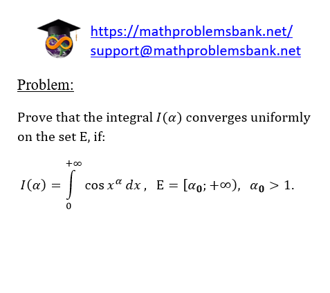 Problem: Prove that the integral \( I(\alpha) \) converges uniformly on the set \( \mathrm{E} \), if: \[ I(\alpha)=\int_{0}^{+\infty} \cos x^{\alpha} d x, \mathrm{E}=\left[\alpha_{0} ;+\infty\right), \alpha_{0}>1 . \]