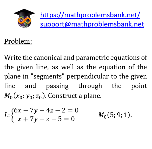Problem: Write the canonical and parametric equations of the given line, as well as the equation of the plane in "segments" perpendicular to the given line and passing through the point \( M_{0}\left(x_{0}: y_{0} ; z_{0}\right) \). Construct a plane. \[ L:\left\{\begin{array}{c} 6 x-7 y-4 z-2=0 \\ x+7 y-z-5=0 \end{array} \quad M_{0}(5 ; 9 ; 1) .\right. \]