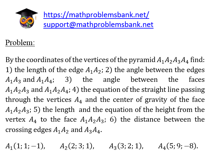 Problem: By the coordinates of the vertices of the pyramid \( A_{1} A_{2} A_{3} A_{4} \) find: 1) the length of the edge \( A_{1} A_{2} ; 2 \) ) the angle between the edges \( A_{1} A_{3} \) and \( \left.A_{1} A_{4} ; 3\right) \) the angle between the faces \( A_{1} A_{2} A_{3} \) and \( \left.A_{1} A_{2} A_{4} ; 4\right) \) the equation of the straight line passing through the vertices \( A_{4} \) and the center of gravity of the face \( \left.A_{1} A_{2} A_{3} ; 5\right) \) the length and the equation of the height from the vertex \( A_{4} \) to the face \( \left.A_{1} A_{2} A_{3} ; 6\right) \) the distance between the crossing edges \( A_{1} A_{2} \) and \( A_{3} A_{4} \). \[ A_{1}(1 ; 1 ;-1), \quad A_{2}(2 ; 3 ; 1), \quad A_{3}(3 ; 2 ; 1), \quad A_{4}(5 ; 9 ;-8) \text {. } \]