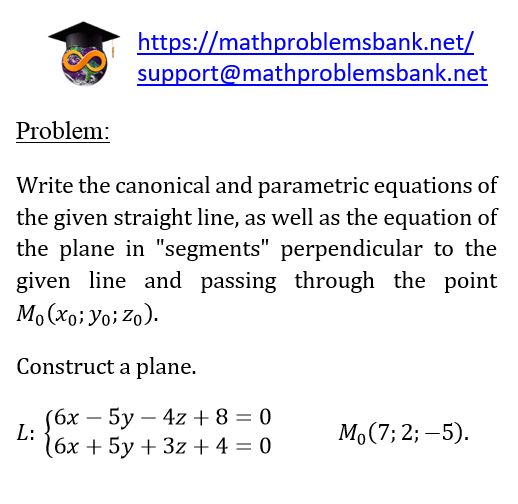Problem: Write the canonical and parametric equations of the given straight line, as well as the equation of the plane in "segments" perpendicular to the given line and passing through the point \( M_{0}\left(x_{0} ; y_{0} ; z_{0}\right) \). Construct a plane. \( L:\left\{\begin{array}{l}6 x-5 y-4 z+8=0 \\ 6 x+5 y+3 z+4=0\end{array} \quad M_{0}(7 ; 2 ;-5)\right. \).