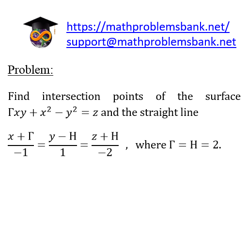 Problem: Find intersection points of the surface \( \Gamma x y+x^{2}-y^{2}=z \) and the straight line \[ \frac{x+\Gamma}{-1}=\frac{y-\mathrm{H}}{1}=\frac{z+\mathrm{H}}{-2} \text {, where } \Gamma=\mathrm{H}=2 \text {. } \]