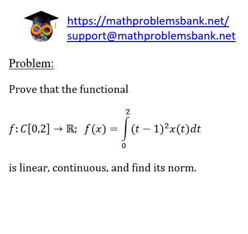 Problem: Prove that the functional \[ f: C[0,2] \rightarrow \mathbb{R} ; f(x)=\int_{0}^{2}(t-1)^{2} x(t) d t \] is linear, continuous, and find its norm.