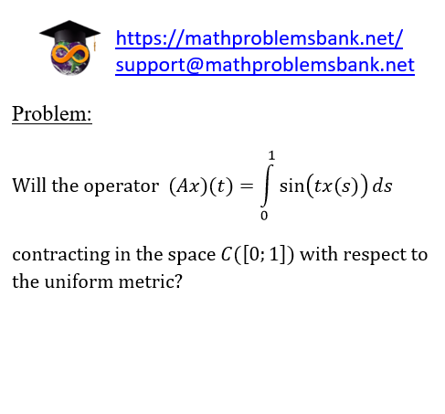 Problem: Will the operator \( (A x)(t)=\int_{0}^{1} \sin (t x(s)) d s \) contracting in the space \( C([0 ; 1]) \) with respect to the uniform metric?