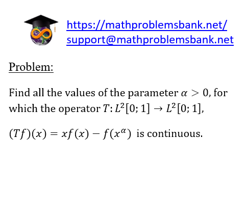 Problem: Find all the values of the parameter \( \alpha>0 \), for which the operator \( T: L^{2}[0 ; 1] \rightarrow L^{2}[0 ; 1] \), \( (T f)(x)=x f(x)-f\left(x^{\alpha}\right) \) is continuous.