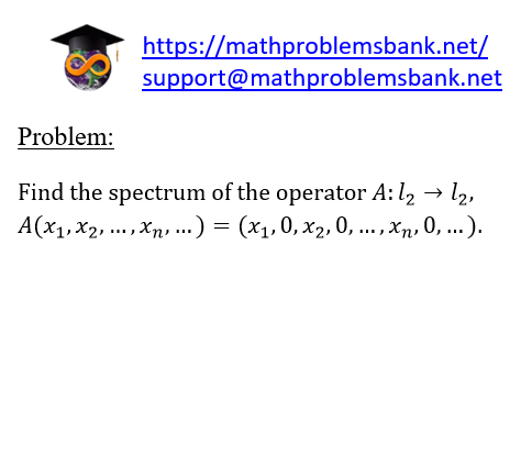 Problem: Find the spectrum of the operator \( A: l_{2} \rightarrow l_{2} \), \( A\left(x_{1}, x_{2}, \ldots, x_{n}, \ldots\right)=\left(x_{1}, 0, x_{2}, 0, \ldots, x_{n}, 0, \ldots\right) \).