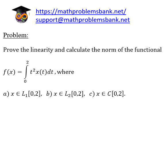 Problem: Prove the linearity and calculate the norm of the functional \( f(x)=\int_{0}^{2} t^{2} x(t) d t \), where a) \( x \in L_{1}[0,2] \), b) \( x \in L_{2}[0,2] \), c) \( x \in C[0,2] \).