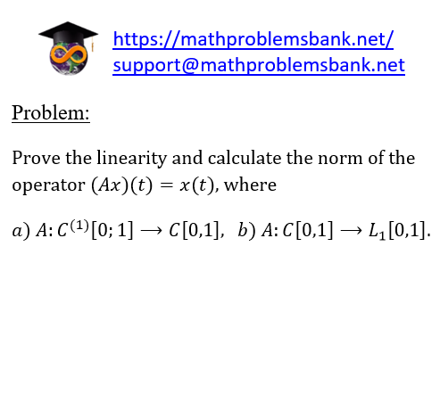 Problem: Prove the linearity and calculate the norm of the operator \( (A x)(t)=x(t) \), where a) \( A: C^{(1)}[0 ; 1] \rightarrow C[0,1] \), b) \( A: C[0,1] \rightarrow L_{1}[0,1] \).