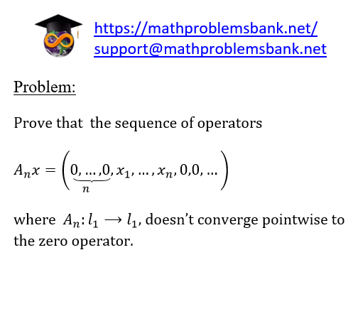 Problem: Prove that the sequence of operators \[ A_{n} x=(\underbrace{0, \ldots, 0}_{n}, x_{1}, \ldots, x_{n}, 0,0, \ldots) \] where \( A_{n}: l_{1} \rightarrow l_{1} \), doesn't converge pointwise to the zero operator.
