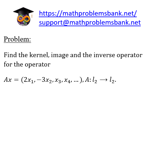 Problem: Find the kernel, image and the inverse operator for the operator \[ A x=\left(2 x_{1},-3 x_{2}, x_{3}, x_{4}, \ldots\right), A: l_{2} \rightarrow l_{2} \text {. } \]
