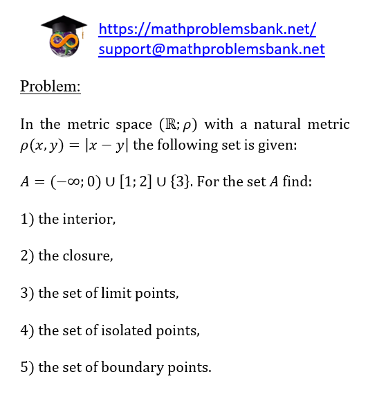 Problem: In the metric space \( (\mathbb{R} ; \rho) \) with a natural metric \( \rho(x, y)=|x-y| \) the following set is given: \( A=(-\infty ; 0) \cup[1 ; 2] \cup\{3\} \). For the set \( A \) find: 1) the interior, 2) the closure, 3) the set of limit points, 4) the set of isolated points, 5) the set of boundary points.
