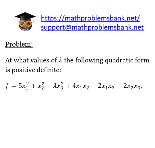 Problem: At what values of \( \lambda \) the following quadratic form is positive definite: \[ f=5 x_{1}^{2}+x_{2}^{2}+\lambda x_{3}^{2}+4 x_{1} x_{2}-2 x_{1} x_{3}-2 x_{2} x_{3} . \]