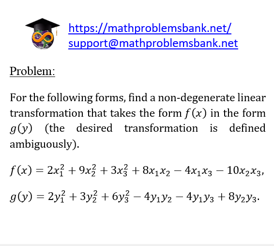 Problem: For the following forms, find a non-degenerate linear transformation that takes the form \( f(x) \) in the form \( g(y) \) (the desired transformation is defined ambiguously). \[ \begin{array}{l} f(x)=2 x_{1}^{2}+9 x_{2}^{2}+3 x_{3}^{2}+8 x_{1} x_{2}-4 x_{1} x_{3}-10 x_{2} x_{3}, \\ g(y)=2 y_{1}^{2}+3 y_{2}^{2}+6 y_{3}^{2}-4 y_{1} y_{2}-4 y_{1} y_{3}+8 y_{2} y_{3} . \end{array} \]