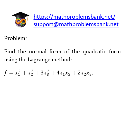 Problem: Find the normal form of the quadratic form using the Lagrange method: \[ f=x_{1}^{2}+x_{2}^{2}+3 x_{3}^{2}+4 x_{1} x_{2}+2 x_{2} x_{3} . \]