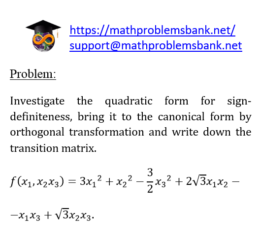 Problem: Investigate the quadratic form for signdefiniteness, bring it to the canonical form by orthogonal transformation and write down the transition matrix. \[ \begin{array}{l} f\left(x_{1}, x_{2} x_{3}\right)=3 x_{1}{ }^{2}+x_{2}{ }^{2}-\frac{3}{2} x_{3}{ }^{2}+2 \sqrt{3} x_{1} x_{2}- \\ -x_{1} x_{3}+\sqrt{3} x_{2} x_{3} . \end{array} \]
